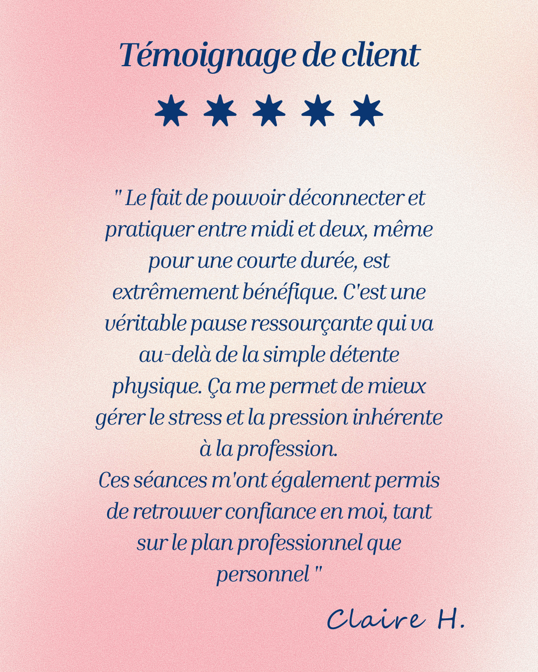 " les cours de yoga hebdomadaires avec Floriane sur notre lieu de travail, sont devenus un rendez-vous bien-être indispensable et convivial entre collègues.